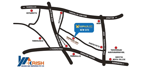 Welcome to Mangalya City, a premium plotted development by Sri Krish Housing and Properties Pvt Ltd, offering 180+ villa plots in the fast-growing Avadi–Sorancheri belt. If you're looking for a plot for sale in Avadi, this community stands out with its prime location on Thiruvallur High Road and effortless access to the Thirumazhisai Outer Ring Road. The gated layout features ready-to-build RERA-approved plots for those seeking a peaceful yet well-connected address.
